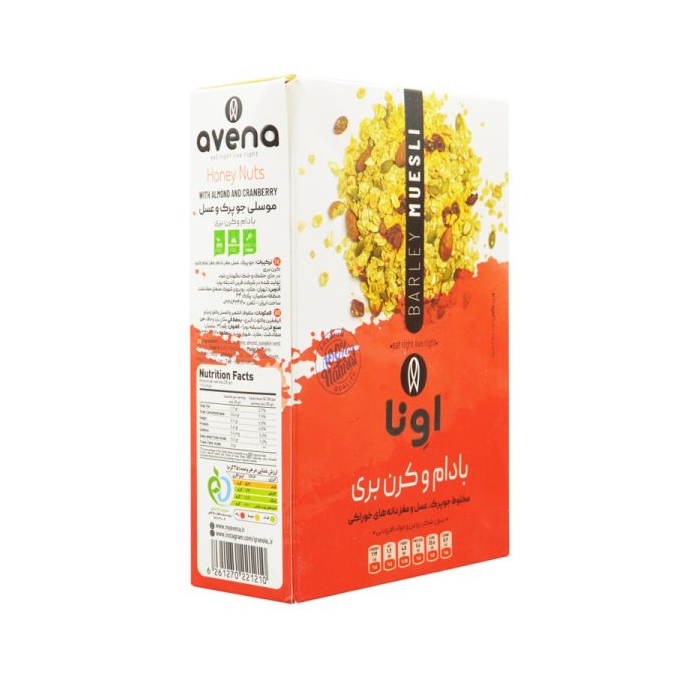 موسلی کارتونی با طعم بادام و کرن بری وزن: 250 گرم میان وعده سالم یا یک صبحانه‌ی خوشمزه و مغذی دارای ارزش غذایی بالا دارای 119.6 کیلوکالری و قند 59 گرم دارای 18% فیبر و 6% پروتئین بدون مواد افزودنی و 100% طبیعی فاقد هرگونه روغن و شکر ترکیبات: جوپرک، عسل، مغز بادام، مغز تخم کدو، کرن بری فواید مصرف موسلی بادام و کرن بری: کاهش کلسترول خون حفظ تناسب اندام جلوگیری از پوکی استخوان بهبود پوست تقویت سیستم ایمنی بدن مبارزه با سرطان و بهبود عملکرد دستگاه گوارش بهترین زمان مصرف: صبحانه، عصرانه و قبل از ورزش قابل ترکیب با آب و شیر قابل استفاده به همراه ماست و تکه های میوه قابل استفاده به تنهایی به عنوان تنقلات مناسب برای ورزشکاران و عموم افراد تهیه آسان و سریع دارای تاریخ انقضای معتبر