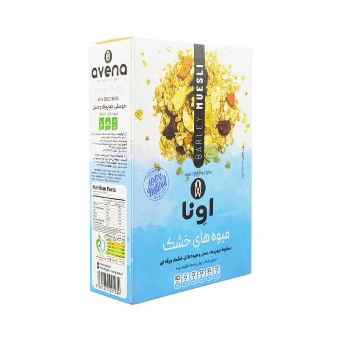 موسلی کارتونی با طعم میوه های خشک وزن: 250 گرم میان وعده سالم یا یک صبحانه‌ی خوشمزه و مغذی دارای ارزش غذایی بالا دارای 114.3 کیلوکالری و قند 6.6 گرم دارای 17% فیبر و 5% پروتئین بدون مواد افزودنی و 100% طبیعی فاقد هرگونه روغن و شکر ترکیبات: جوپرک، عسل، میکس میوه های خشک فواید مصرف موسلی میوه های خشک: کاهش کلسترول خون حفظ تناسب اندام جلوگیری از پوکی استخوان بهبود پوست تقویت سیستم ایمنی بدن مبارزه با سرطان و بهبود عملکرد دستگاه گوارش بهترین زمان مصرف: صبحانه، عصرانه و قبل از ورزش قابل ترکیب با آب و شیر قابل استفاده به همراه ماست و تکه های میوه قابل استفاده به تنهایی به عنوان تنقلات مناسب برای ورزشکاران و عموم افراد تهیه آسان و سریع دارای تاریخ انقضای معتبر