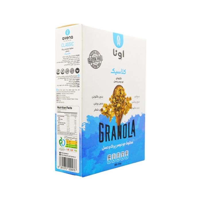 گرانولای کارتونی کلاسیک با طعم جو دوسر و عسل وزن: 650 گرم میان وعده سالم یا یک صبحانه‌ی خوشمزه و مغذی دارای ارزش غذایی بالا دارای 120.6 کیلوکالری دارای 3.6 گرم پروتئین و 2.9 گرم فیبر بدون مواد افزودنی و گلوتن 100% طبیعی فاقد هرگونه روغن و شکر فواید مصرف گرانولای کلاسیک جو دو سر و عسل: کاهش کلسترول خون کاهش وزن سیری بلند مدت تنظیم قند خون تقویت سیستم ایمنی بدن مبارزه با سرطان و بهبود عملکرد دستگاه گوارش بهترین زمان مصرف: صبحانه، عصرانه و قبل از ورزش قابل ترکیب با آب و شیر قابل استفاده به همراه ماست و تکه های میوه قابل استفاده به تنهایی به عنوان تنقلات مناسب برای ورزشکاران و عموم افراد تهیه آسان و سریع دارای تاریخ انقضای معتبر