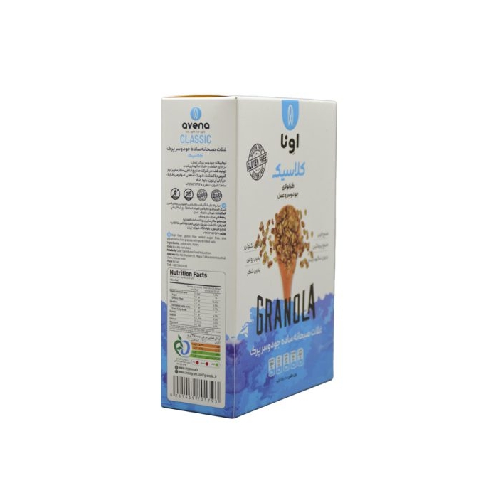 گرانولای کارتونی کلاسیک با طعم جو دوسر و عسل وزن: 250 گرم میان وعده سالم یا یک صبحانه‌ی خوشمزه و مغذی دارای ارزش غذایی بالا دارای 120.6 کیلوکالری دارای 3.6 گرم پروتئین و 2.9 گرم فیبر بدون مواد افزودنی و گلوتن 100% طبیعی فاقد هرگونه روغن و شکر فواید مصرف گرانولای کلاسیک جو دو سر و عسل: کاهش کلسترول خون کاهش وزن سیری بلند مدت تنظیم قند خون تقویت سیستم ایمنی بدن مبارزه با سرطان و بهبود عملکرد دستگاه گوارش بهترین زمان مصرف: صبحانه، عصرانه و قبل از ورزش قابل ترکیب با آب و شیر قابل استفاده به همراه ماست و تکه های میوه قابل استفاده به تنهایی به عنوان تنقلات مناسب برای ورزشکاران و عموم افراد تهیه آسان و سریع دارای طرح avena دارای تاریخ انقضای معتبر
