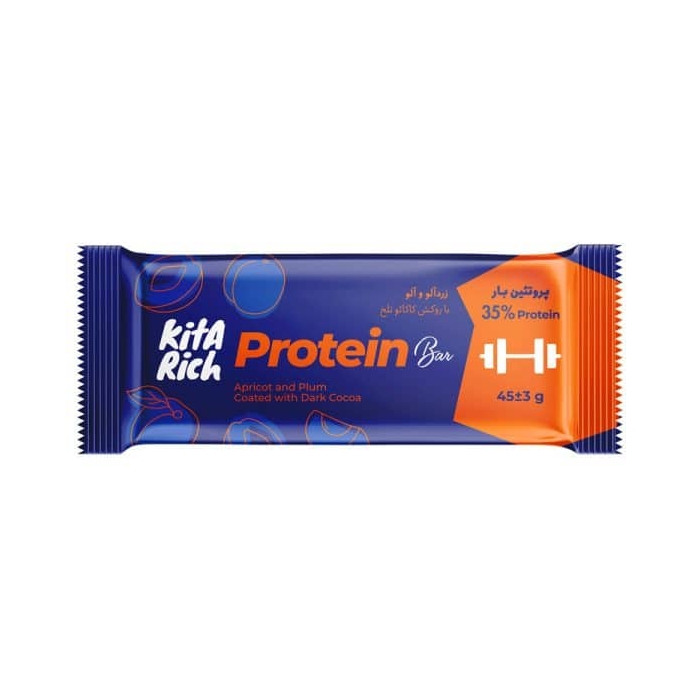 شکلات پروتئین بار کیتاریچ زردآلو و آلو با روکش کاکائو تلخ ۴۵ گرمی