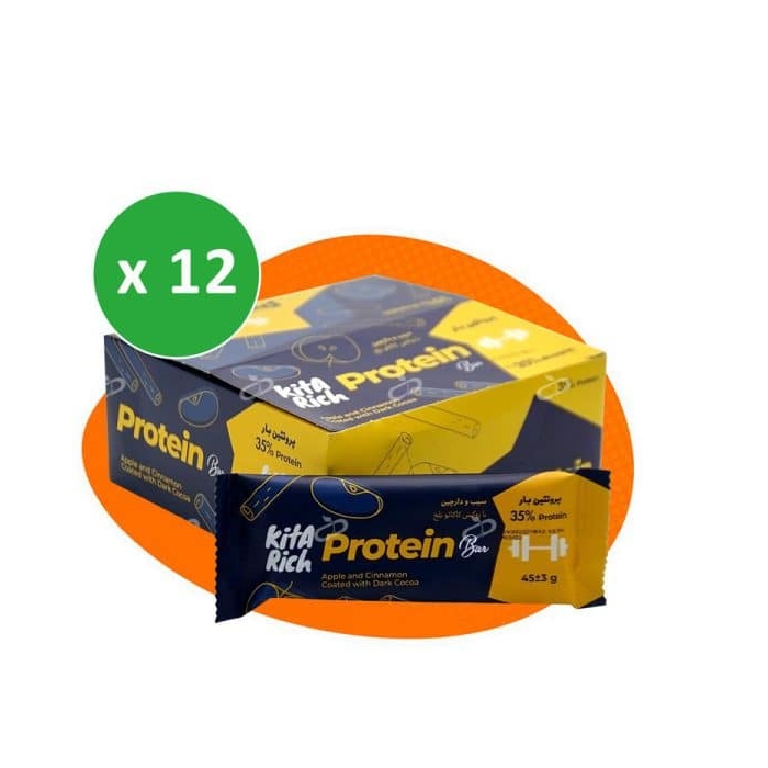پکیج شکلات پروتئین بار کیتاریچ سیب و دارچین با روکش کاکائو تلخ ۴۵ گرمی بسته ۱۲ عددی