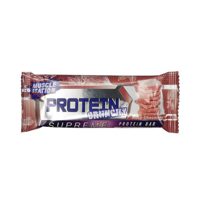 پکیج شکلات پروتئین بار ماسل استیشن مدل کرانچی یاقوتی ۴۰ گرمی بسته ۱۲ عددی