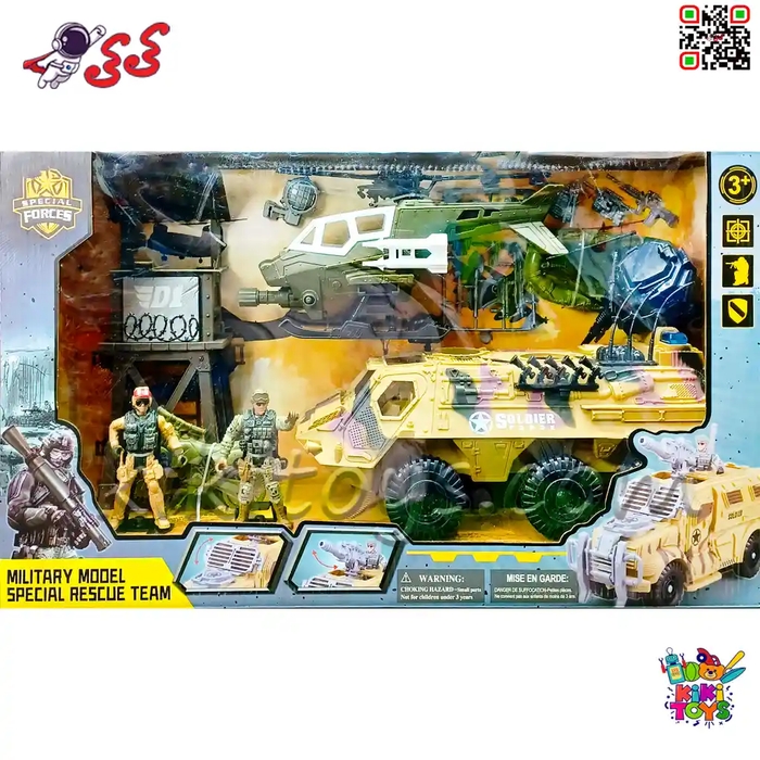 ست اسباب‌بازی نظامی شامل نفربر زرهی، هلی‌کوپتر جنگی، دو سرباز، برج مراقبت و تجهیزات نظامی. مناسب برای کودکان بالای ۳ سال، بدون نیاز به باتری، تقویت‌کننده تخیل، مهارت‌های حرکتی و بازی‌های گروهی پسرانه.