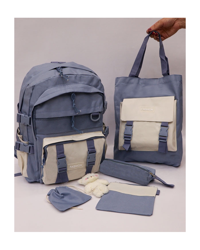 دارای 5 تیکه می باشدکه شامل کوله پشتی-کیف غذا -جامدادی-کیف به همراه بند کنفی-کیف کوچک