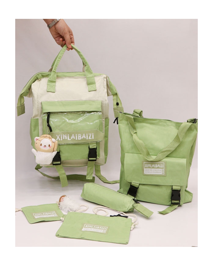 دارای 5 تیکه می باشدکه شامل کوله پشتی-کیف غذا -جامدادی-کیف به همراه بند کنفی-کیف کوچک داخل کیف آستر دوزی داخل کیف محفظه جدا کننده دارد تمامی اندازه ها حدودی میباشد.
