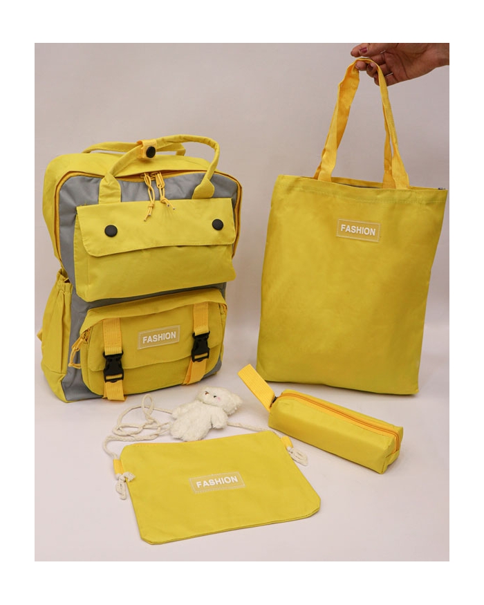 دارای 5 تیکه می باشدکه شامل کوله پشتی-کیف غذا -جامدادی-کیف به همراه بند کنفی-