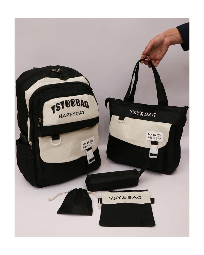 دارای 5 تیکه می باشدکه شامل کوله پشتی-کیف غذا -جامدادی-کیف به همراه بند کنفی-کیف کوچک داخل کیف آستر دوزی داخل کیف محفظه جدا کننده دارد تمامی اندازه ها حدودی میباشد.