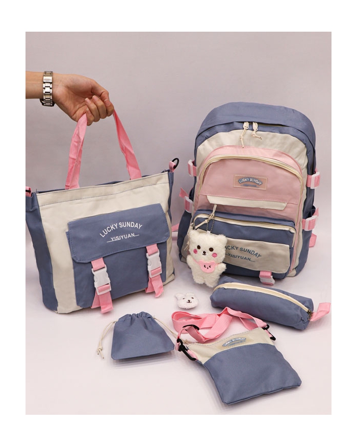 دارای 5 تیکه می باشدکه شامل کوله پشتی-کیف غذا -جامدادی-کیف به همراه بند کنفی-کیف کوچک