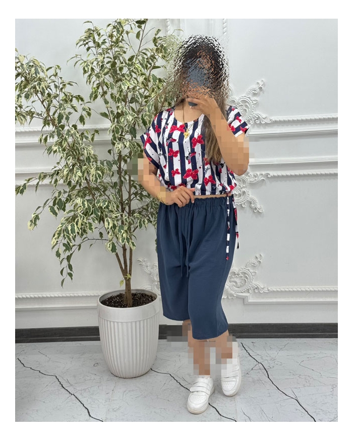 فری سایز مناسب سایز 36 تا 46-دورسینه کراپ 120 سانت-دور حلقه بازو 50 سانت-قد کراپ 45 سانت-دور کمر شلوارک 125 سانت با کشسانی-قد فاق شلوارک 36 سانت-قد شلوارک 60 سانت