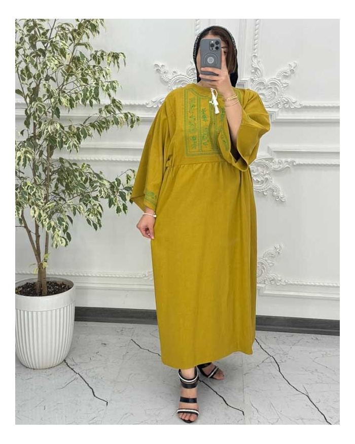 پیراهن لینن گلدوزی آستین کیمونو خردلی 6025