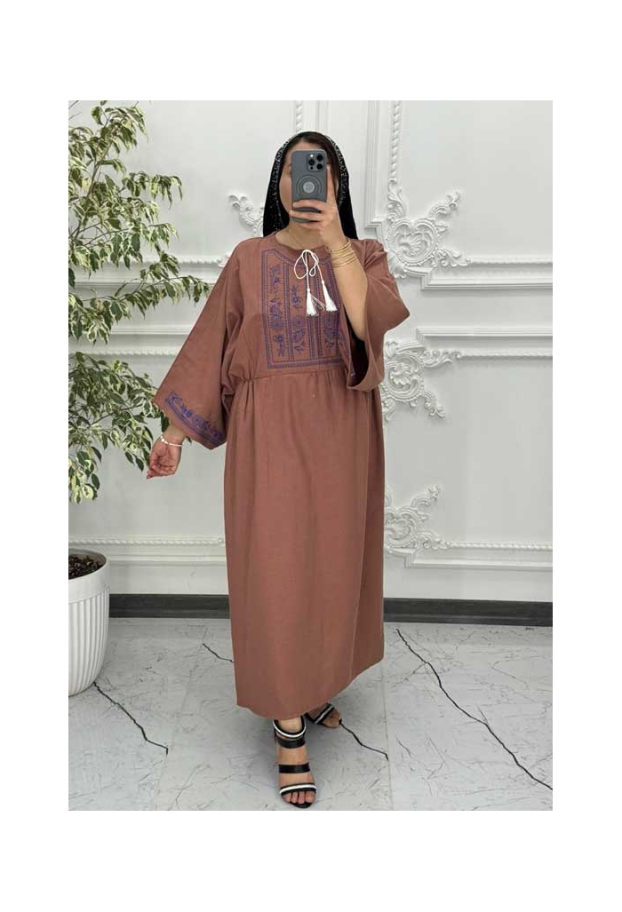 پیراهن لینن گلدوزی آستین کیمونو آجری 6026
