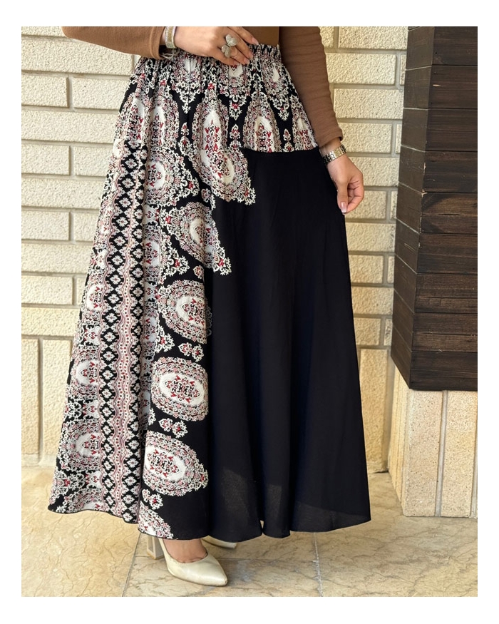 سایز بندی فری سایز مناسب سایز 40 تا 60-گشادی دور کمر با کشسانی 140cm-دور باسن 160cm-قد دامن 100cm-جنس نخی شسته شده بدون آب رفت و رنگ رفت پارچه کار گرم بالا