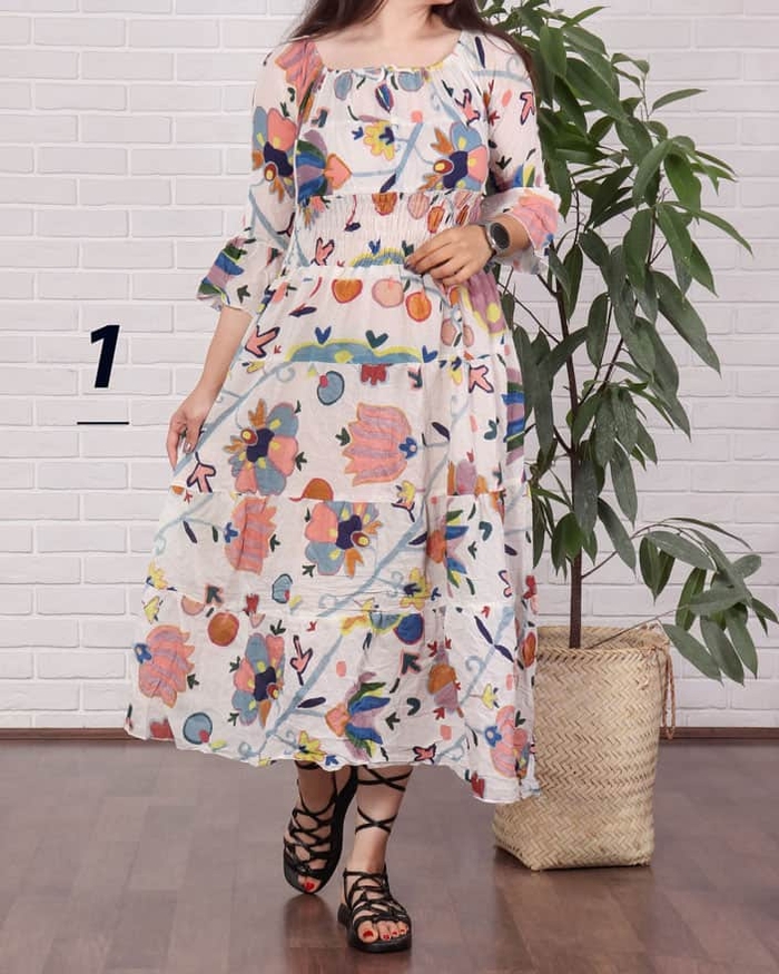 پیراهن عروسکی آستین بلند شیوان-سایزبندی(فری سایز مناسب سایز 36تا48)-گشادی دورسینه در حالت کشسانی 110 سانت-گشادی دور باسن 130 سانت-قدکار حدود 125الی 130