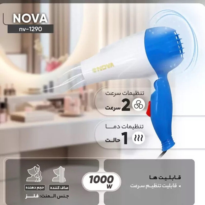 اگر به دنبال یک سشوار سبک، کممصرف و در عین حال قدرتمند برای سفر هستید، سشوار مسافرتی نوا مدل NV-1290 بهترین انتخاب شماست. این محصول با طراحی جمعوجور و قابلیت تا شدن دسته، بهراحتی در چمدان یا کیف جا میگیرد و برای استفادهی روزمره و مسافرتی بسیار کاربردی است.-✨ ویژگیها: • توان مصرفی: 1000 وات • تنظیمات سرعت: 2 سرعت مختلف برای کنترل جریان باد • تنظیمات دما: 1 حالت حرارت • نوع المنت: فلزی با پخش یکنواخت گرما • کاربرد: صافکننده و حجمدهنده مو • طراحی ارگونومیک و سبک با دستهی آبی رنگ و بدنه سفید-⸻-🌍 مناسب برای:-خانمها و آقایانی که در سفر نیاز به یک سشوار قابلحمل، کمصدا و بادوام دارند. همچنین برای سالنهای زیبایی، خوابگاهها و مسافرخانهها گزینهای ایدهآل است.-⸻-💬 چرا از بازار بزرگ بخریم؟-فروشگاه آنلاین ما به عنوان یکی از تأمینکنندگان فعال بازار بزرگ ترکمن، محصولات نوا را با ضمانت کیفیت، قیمت عمده و ارسال سریع به سراسر کشور عرضه میکند. اگر قصد خریدسشوار نوا را دارید، با ما در تماس باشید تا بهترین قیمت را دریافت کنید.